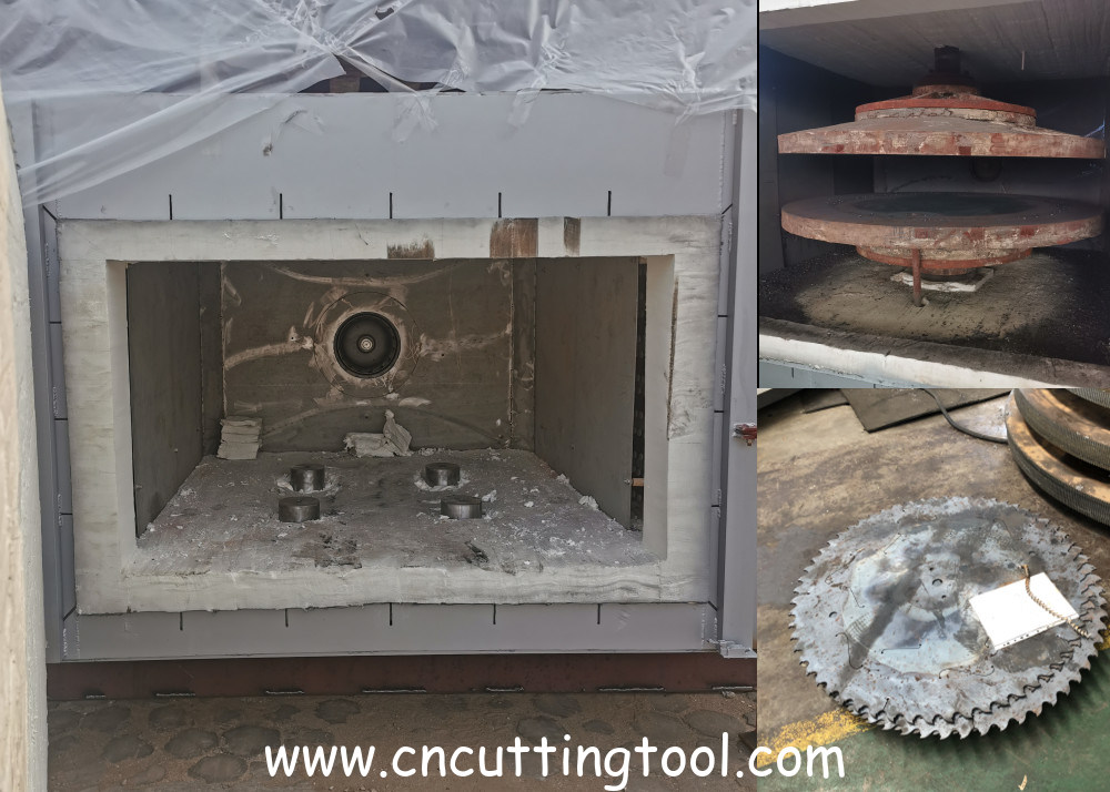 Furonnerie de tempérage de la lame de scie pressée à chaud: le four utilise du coton isolant en fibres comme matériau isolant, et la lame de scie est introduite et sortie du four par un chariot élévateur.La lame de scie est trempée dans le four., et la structure métallographique change sous une certaine pression tout au long du processus, de sorte que la lame de scie peut assurer la planéité sous pression,et en même temps il peut éliminer la tension excessive sur la surface de la lame de scie.